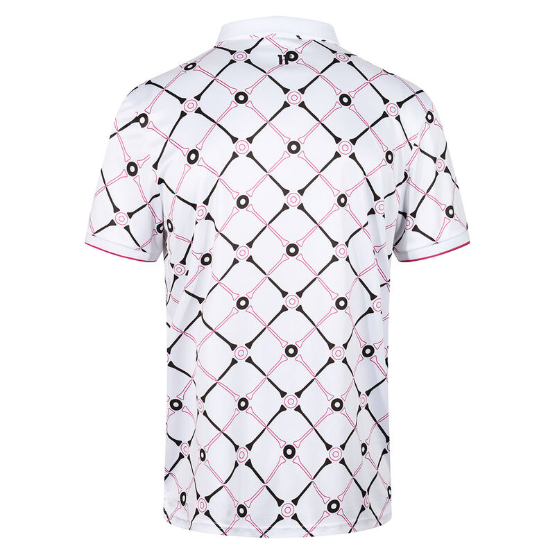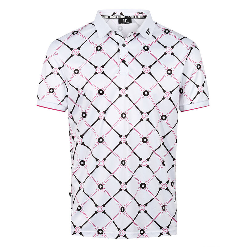 This modern performance polo shirt has a polyester interlock fabric construction, providing comfort and breathability as you play the sport of golf. The design features a snap 3-button placket, rib collar, and cuffs with contrasting tipping colour. Highlighted with stylish all-over sublimated tee print, with Eleven Degrees branding on collar and woven side label. Regular Fit.