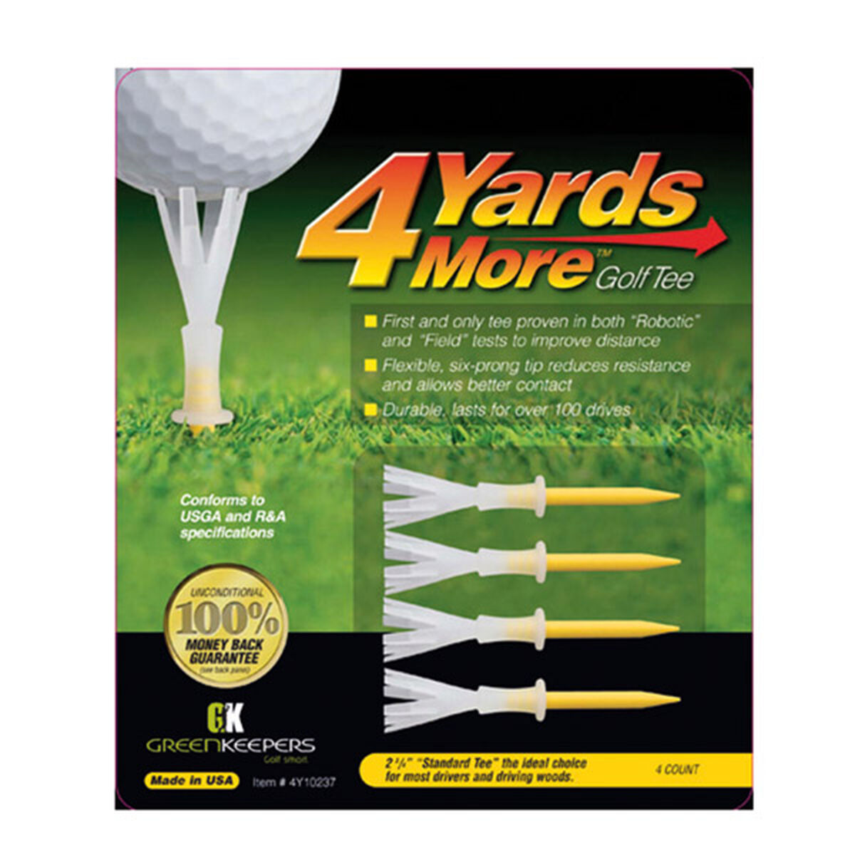 These durable golf tees have been developed using robotic field tests to improve distance performance. They have a highly durable construction that can last over 100 drives and are more flexible. The innovative design features a 6-prong tip which reduces resistance for better contact with the golf ball to improve performance.