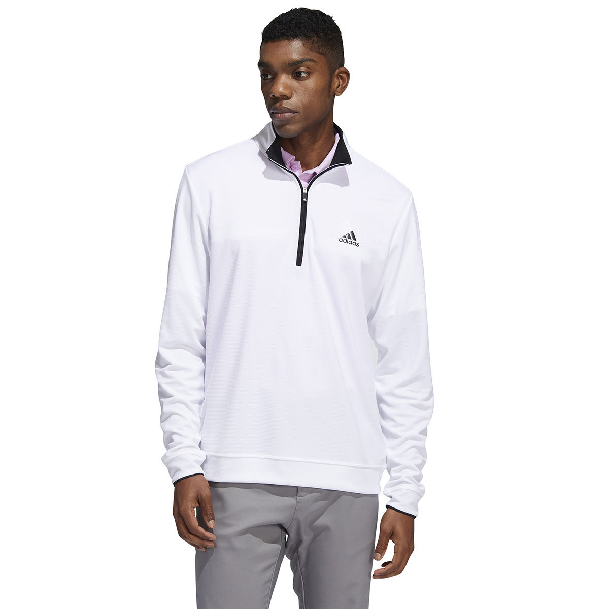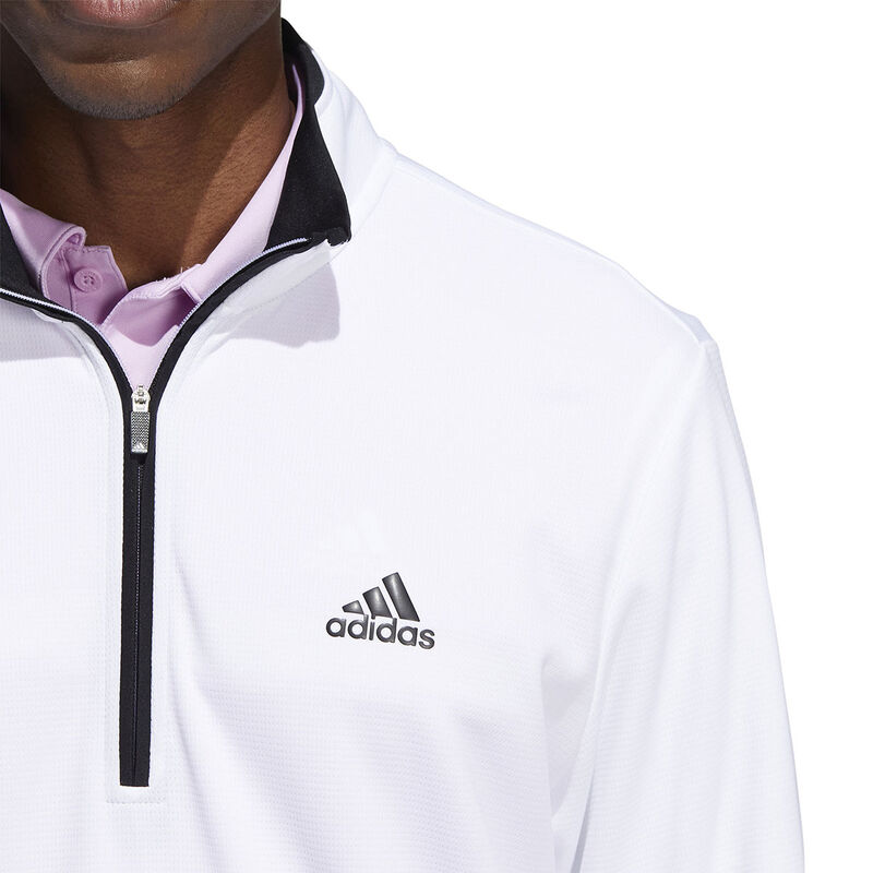 Be confident to perform with this lightweight mid layer from adidas Golf. Constructed with a soft and stretchy doubleknit fabric to give you the confidence to perform at the highest level of golf. The garment has a sporty design and has a high UV 50+ factor rating to protect your body from harmful rays. The garment has a stand collar, 1/4 zip opening and is highlighted with the adidas badge of sport on the left chest.