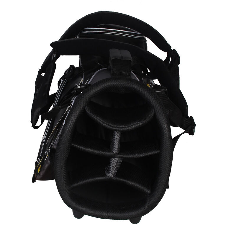The Callaway Warbird is a lightweight and comfortable golf bag. Which will take the weight of your golfing equipment evenly over the shoulders, thanks to the dual strap for maximum comfort and balance. The bag is sub 4.41 lbs in weight and has a high mounted automatic stand system for added stability when you place your golf bag down on the ground.