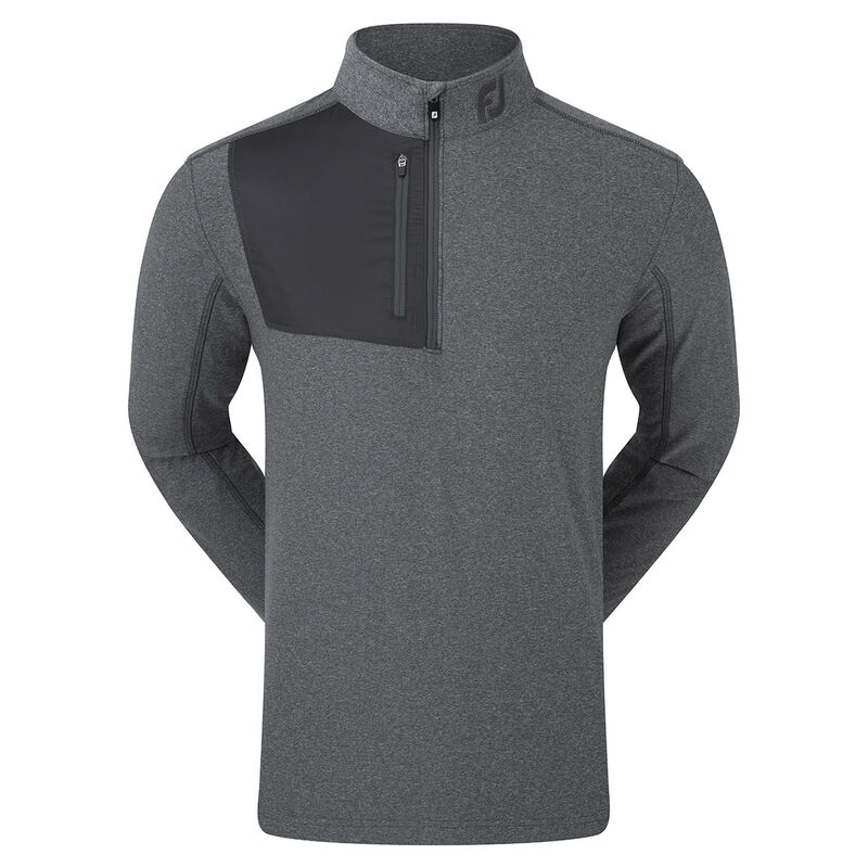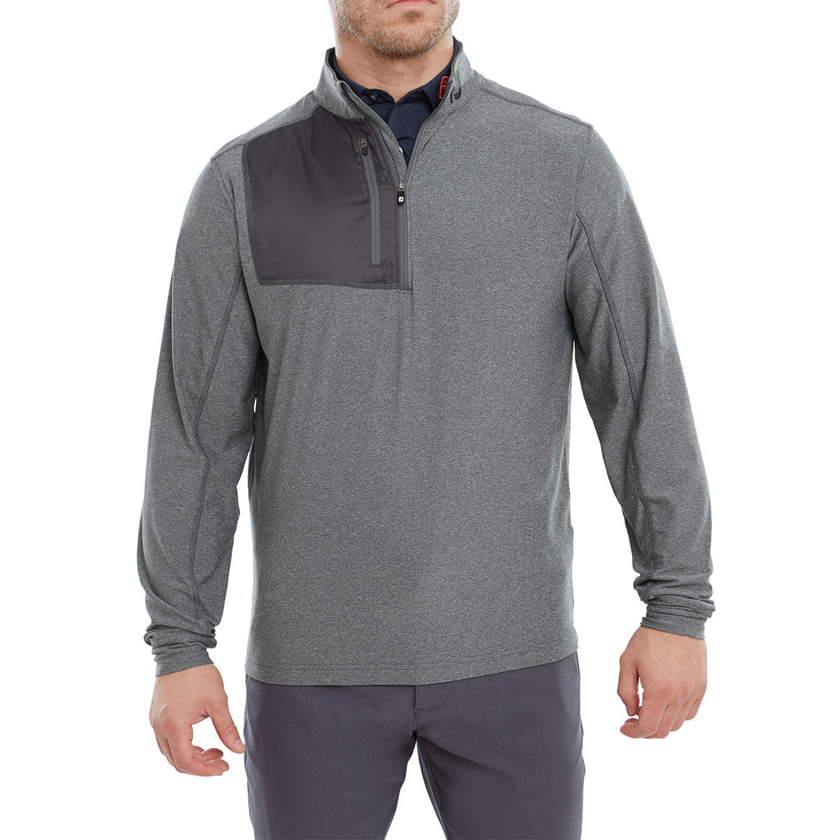 Play golf in comfort with this premium golf mid layer from FootJoy. Constructed with a stretch heather jersey fabric with a brushed interior lining for thermal retention. The garment has moisture-wicking technology to move moisture away from the body and is easy-care for a great look with minimum effort. The design features a half-zip opening, raised neck, and a tonal contrast woven chest pocket for additional storage. Highlighted with FJ branding for maximum appeal.