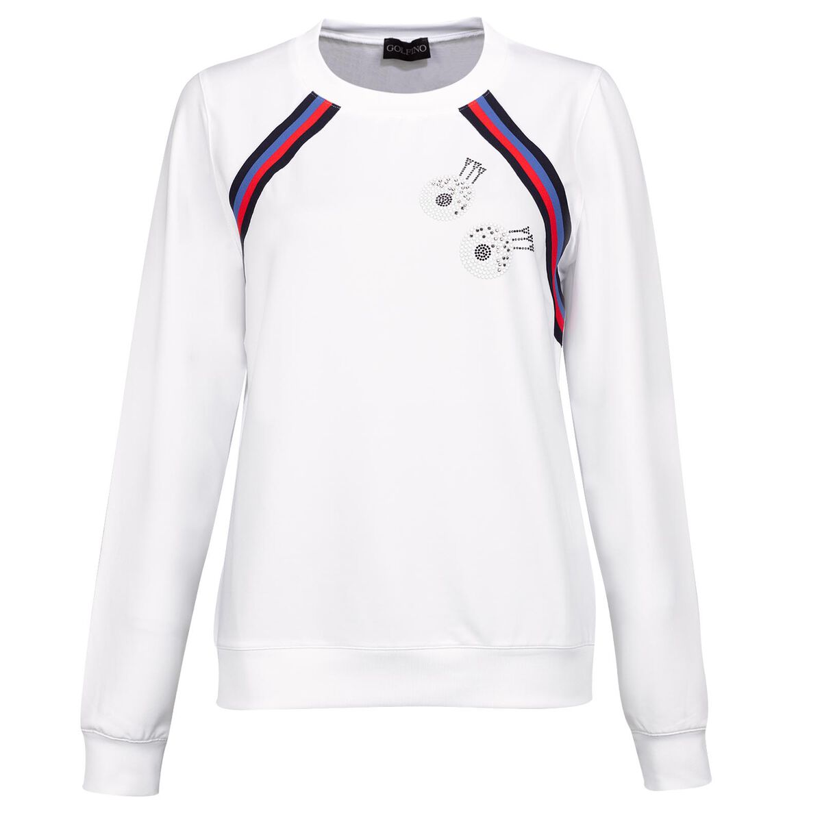 Golfino retro sport sweater with stretch function and trend-setting rhinestone. The premium sweater is pleasantly soft, elastic and breathable. The stretchy jersey material is comfortable to wear as a 2nd layer in your golfing wardrobe. Play with plenty of room to move, as the materials have been developed especially for the needs of the modern golfer. Very sporty retro style with great colours and shiny appliqu