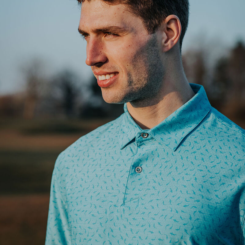 This high-performance polo shirt allows you to play golf with zero distractions. A technical shirt with added stretch to enable you to move freely as you swing the golf club. Equipped with PlayDry moisture management to help you stay cool, dry and comfortable with a 30+ UV protection rating to keep you safe from harmful rays. The design features a shark shadow foulard print, a tailored collar, button placket, plus is highlighted with a Shark logo on the left hem.