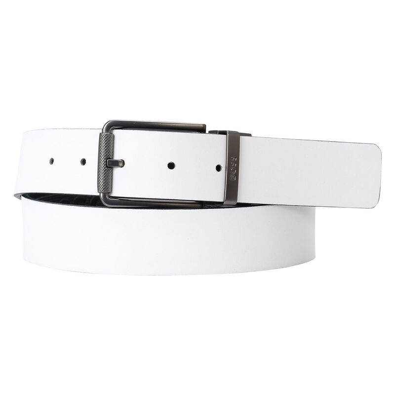 This signature golf belt is made with Italian cow skin leather by BOSS. Featuring a reversible design with a plain finish on one side, and logo structures in repeat on the other. Cut to a 3.5cm width and highlighted with a matte gunmetal pin buckle for maximum appeal.