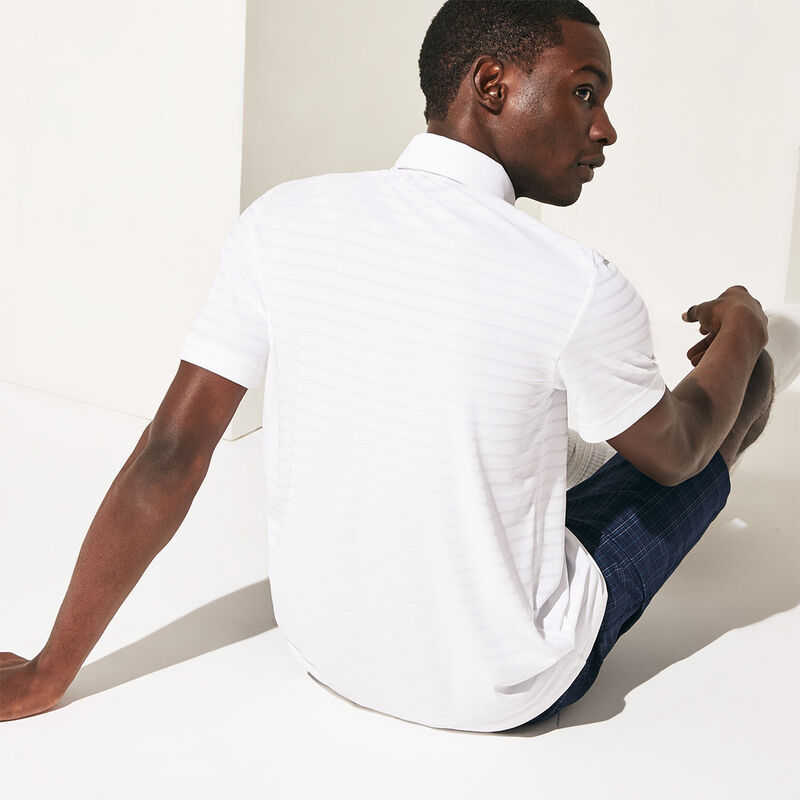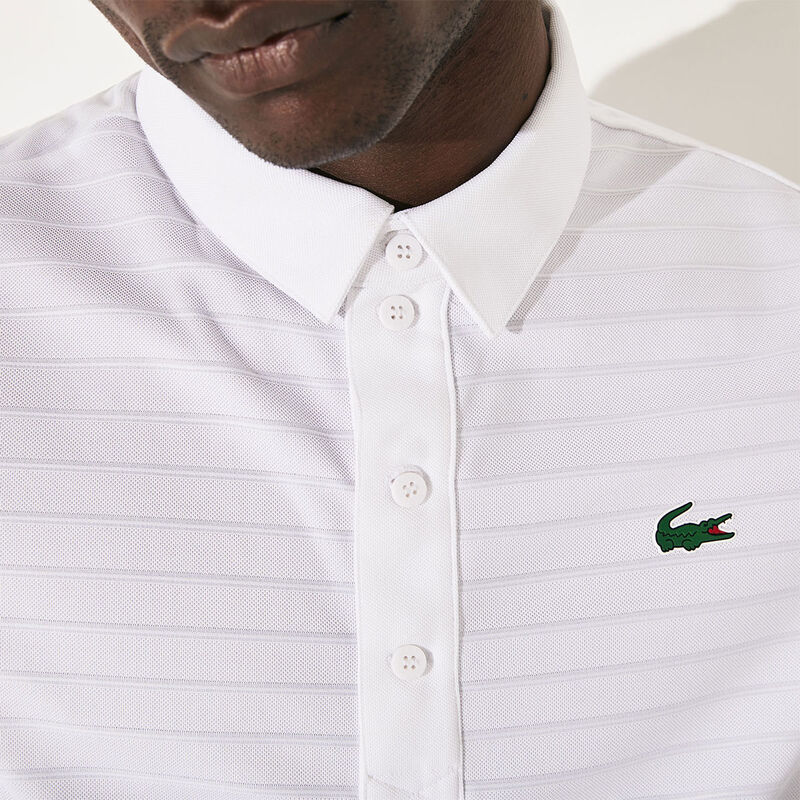 This premium brand polo shirt offers a higher level of quality and elegance. It has a striped appearance which is constructed with an ultra-dry stretch jacquard fabric for the ultimate in comfort and performance. It has a 4-button placket and fold-over collar and is highlighted with the iconic green crocodile on the left chest.