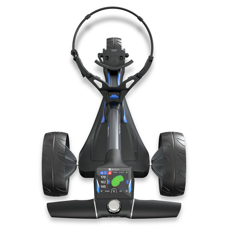 The Motocaddy S5 GPS electric golf trolley is compact and easy to fold, offering fully‑integrated GPS for over 40,000 pre-loaded courses through its super-responsive 3.5” touchscreen display.