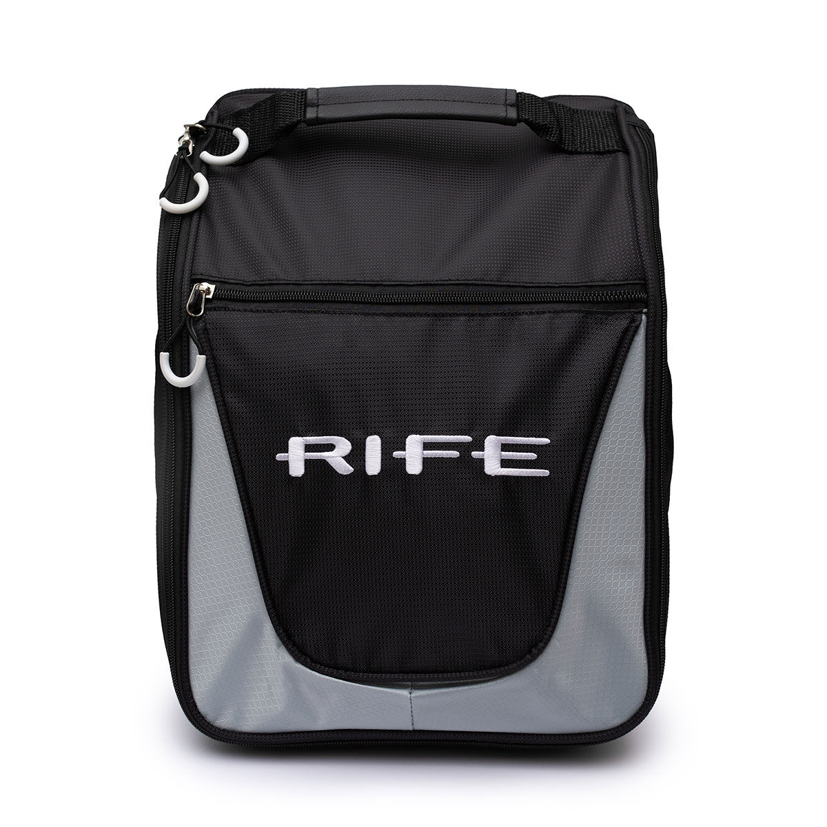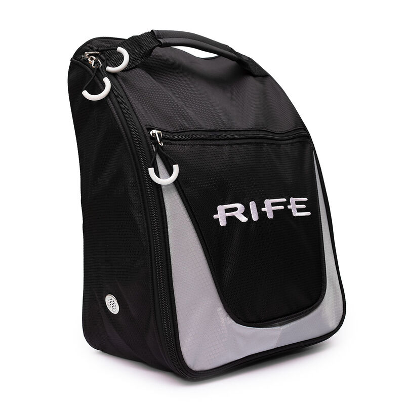 The Rife shoe bag design features dual zips for easy access and has a large main compartment with an internal divider to provide optimum storage for your shoes. Constructed with a highly durable dobby nylon material, with a robust lift assist handle on the top for easy transportation. Other features include breathable side vents holes to provide increased airflow, this prevents the build-up of unwanted odour and moisture. Highlighted with contrasting colour details and a Rife embroidered logo to maximise appeal.