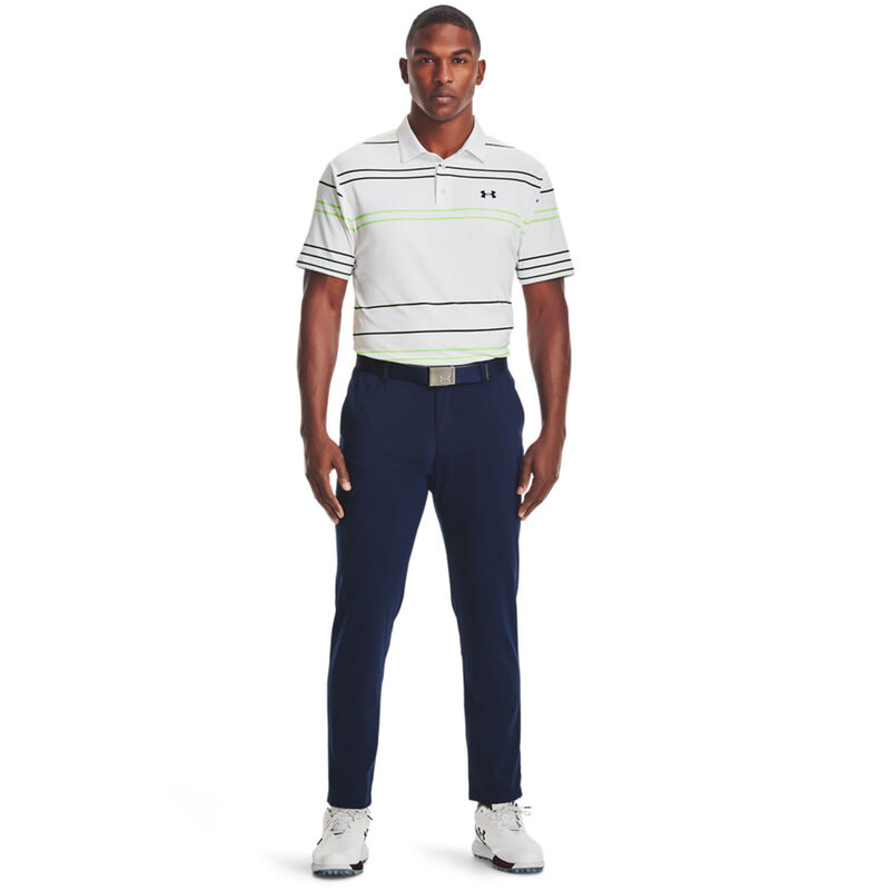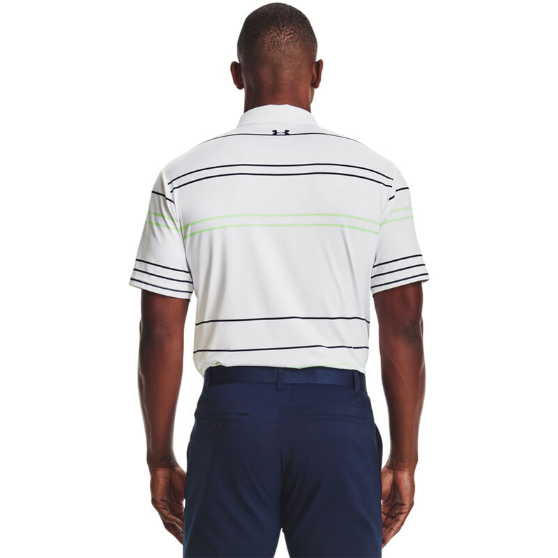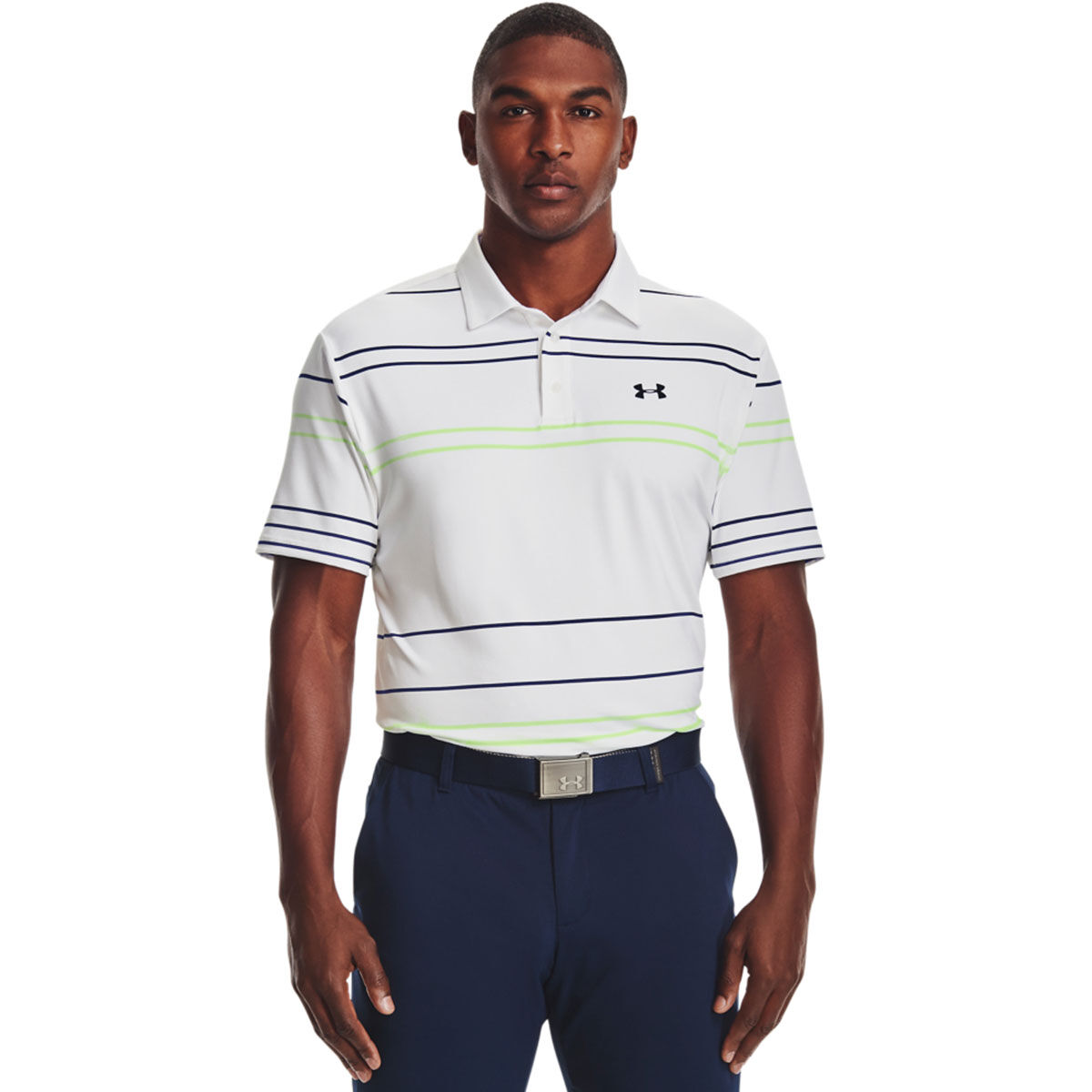 Aim to beat your rivals out on the golf course, in this top-performing golf shirt from Under Armour. This garment has been constructed with moisture-wicking material that dries really fast, with a UPF 30+ protection rating to keep you safe from harmful rays. For added performance, a 4-way stretch ensures you can move freely during any athletic movements associated with the golf swing, plus the garment feels smooth and has an anti-odour technology for less distraction during your game of golf. The striped design features a self-fabric collar and button placket and is highlighted with UA heat seal logos.
